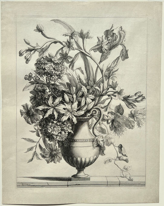 Vase with Irises, Tuberoses, and Lilies, with serpentine handle and grotesque head , from Livre de vases opaques