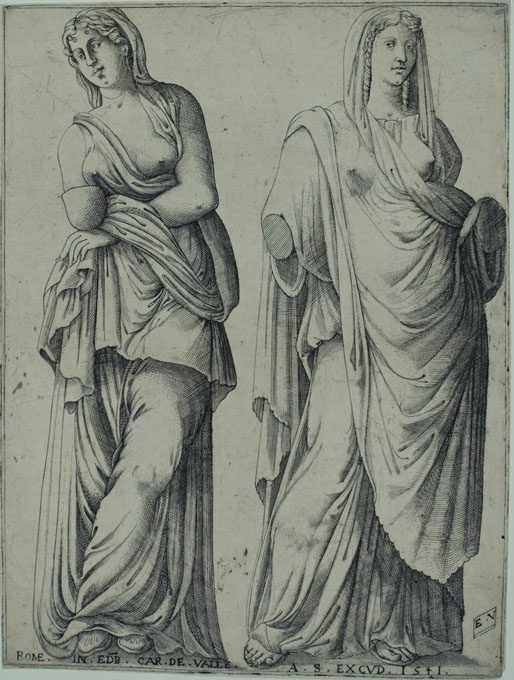 Two Roman female Statues, one a Priestess, from a series of three plates of the antique statues in the palace of the Cardinal de Valle in Rome