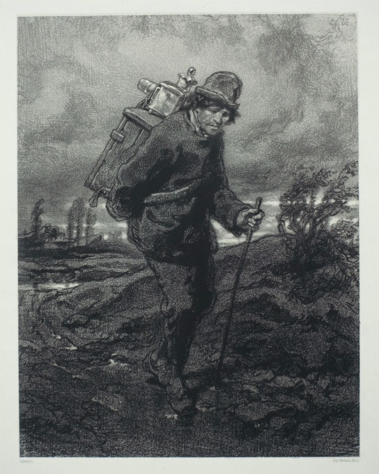 In addition to the many caricatures Gavarni drew, his social commentary could be trenchant and sympathetic, as in the case of the weary magic lantern projectionist carrying his heavy burden home at the end of the day. Gavarni’s superb draughtsmanship and use of the rich, oily blacks available in lithography place him among the best mid-century practitioners of the medium.