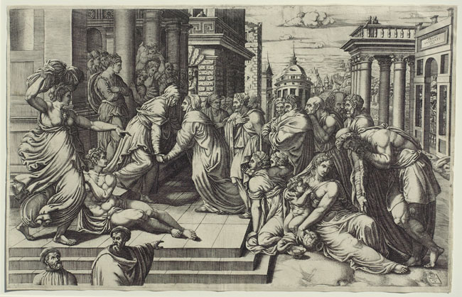 This striking print sets the encounter of two women, the Virgin Mary and her cousin Elizabeth, exchanging intimate news of their respective pregnancies, in the midst of a crowded scene with both onlookers and people going about their business. Based on a fresco by Francesco Salviati painted for the oratorio of San Giovanni Decollato in Rome, the engraving's differences suggest it may have made use of an intermediate design which Ghisi could have acquired during his trip to Rome in the 1540's. The influential fresco was interpreted by two other early engravers, one the contemporary Bartolomeo Passaroti (in the reverse), the other by the next-generation Netherlandish engraver Jacob Matham.