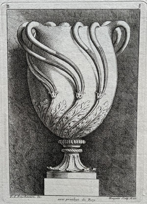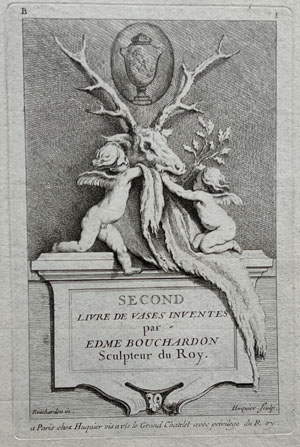 Huquier is best known as a designer and engraver of ornamental prints, a genre in which he displayed much inventiveness and playfulness. Other well-known artists, such as Watteau, Boucher, Meissonier, and here Bouchardon, collaborated with him. His prints could serve as inspiration for craftsmen working in many other mediums.